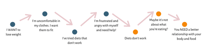 Many dietitians, nutritionists, therapists and coaches (among others) help people lose weight. But what they know is that focusing on the weight loss as the outcome is NOT what they NEED. What they NEED is to address their relationship with their body and food, not what they’re eating. Because they have a better relationship with food weight loss MAY happen, but focusing on the weight loss as the end goal is not a good way to lose weight (believe me on this).